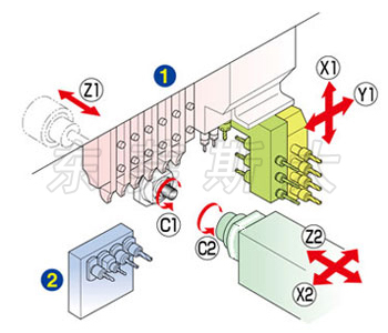 | 四、斯大走心機(jī)SB-20RtypeG在標(biāo)準(zhǔn)規(guī)格橫向鉆孔單元4軸的基礎(chǔ)上,可配備橫向鉆孔單元5軸型、可交換式橫向鉆孔單元5軸型/5軸高速型4種刀架臺,而可交換式橫向鉆孔單元5軸中的右側(cè)3軸及背面4軸單元,采用模塊化設(shè)計配備豐富的刀具單元,可根據(jù)工件需要自由安裝多種可交換式工具,展開多樣的復(fù)合加工。 |